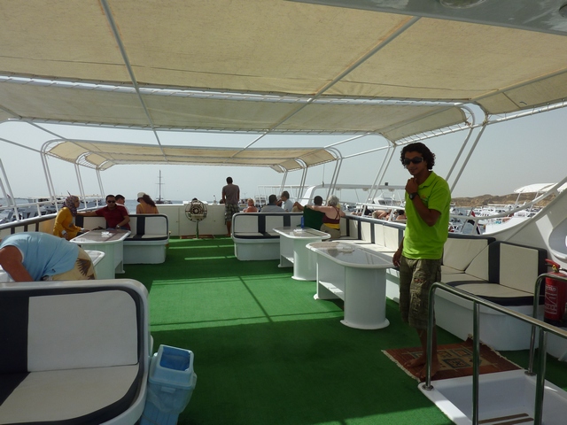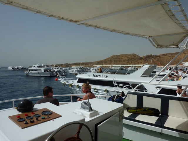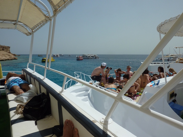 Our stay in Sharm was a bit of a disappointment. The plan was to spend a couple of days snorkeling in the Red Sea at what are supposed to be some of the best snorkeling spots anywhere. Unfortunately the weather didn't cooperate. It was so windy the first two days that the snorkeling trips were cancelled. We finally went out on the third day but again it was very windy and rough. After about an hour of rough motoring, we arrived at our first snorkel sight. It was so rough there and the visibility was so poor that the crew decided to move on. We climbed back aboard and set off to the next sight. Here the snorkeling was moderately better but it was crowded with other boats and lots of people in the water. Apparently with the conditions as they were, there were a limited number of usable sights. The boats would tie up together and be 3, 4 and 5 across. Not too pleasant snorkeling. Fortunately, the boat was nice and there was plenty of room. So the excursion wound up being a rough boat ride rather than a snorkel trip.
