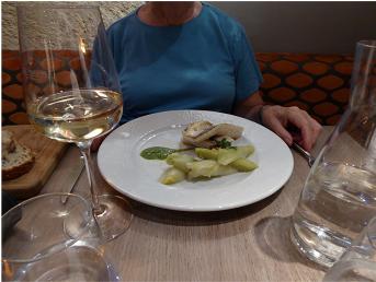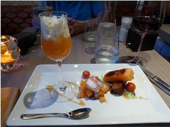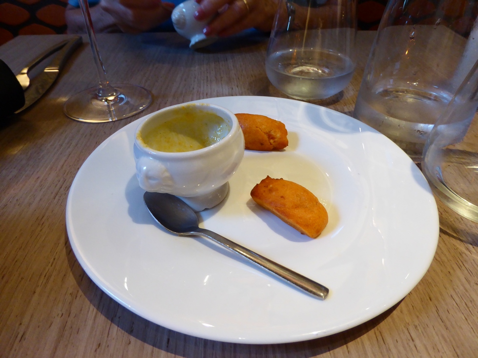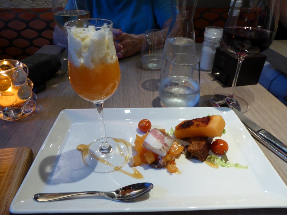 Next on the schedule was DINNER. We had been told about a restaurant, Le Christine, not too far from the D'Orsay. Checked it out online and made our reservation. Dinner was quite good. First we were treated to a small "appetizer" consisting of carrot soup and a cheese ball. Granny skipped an appetizer and I had melon many ways. It was very good and refreshing. Granny followed with whiting and I had veal shoulder. Both good but not great. For dessert we shared a creme brulee. I forgot to get a picture of that.