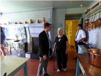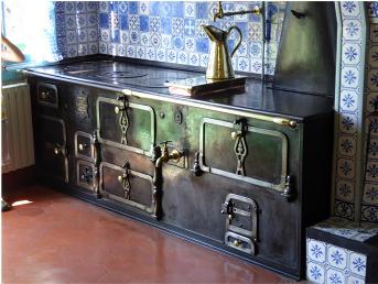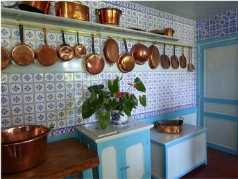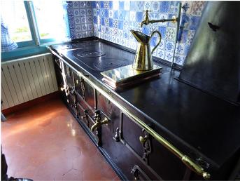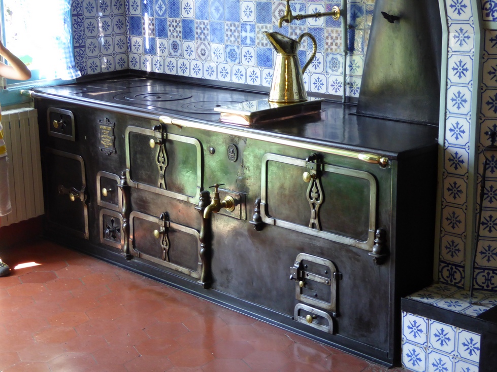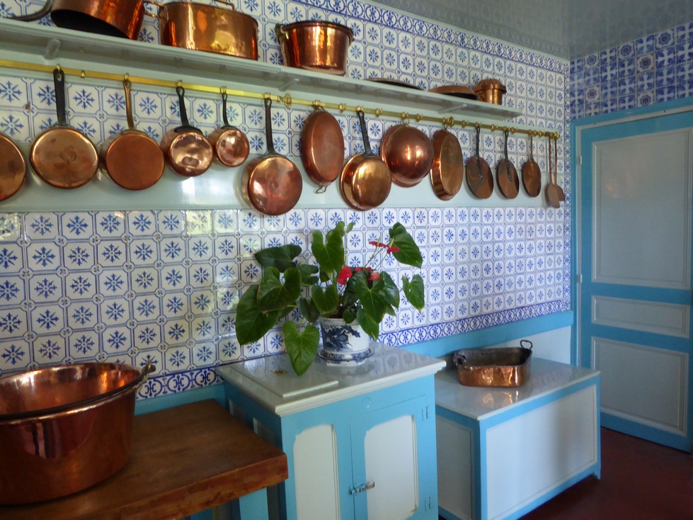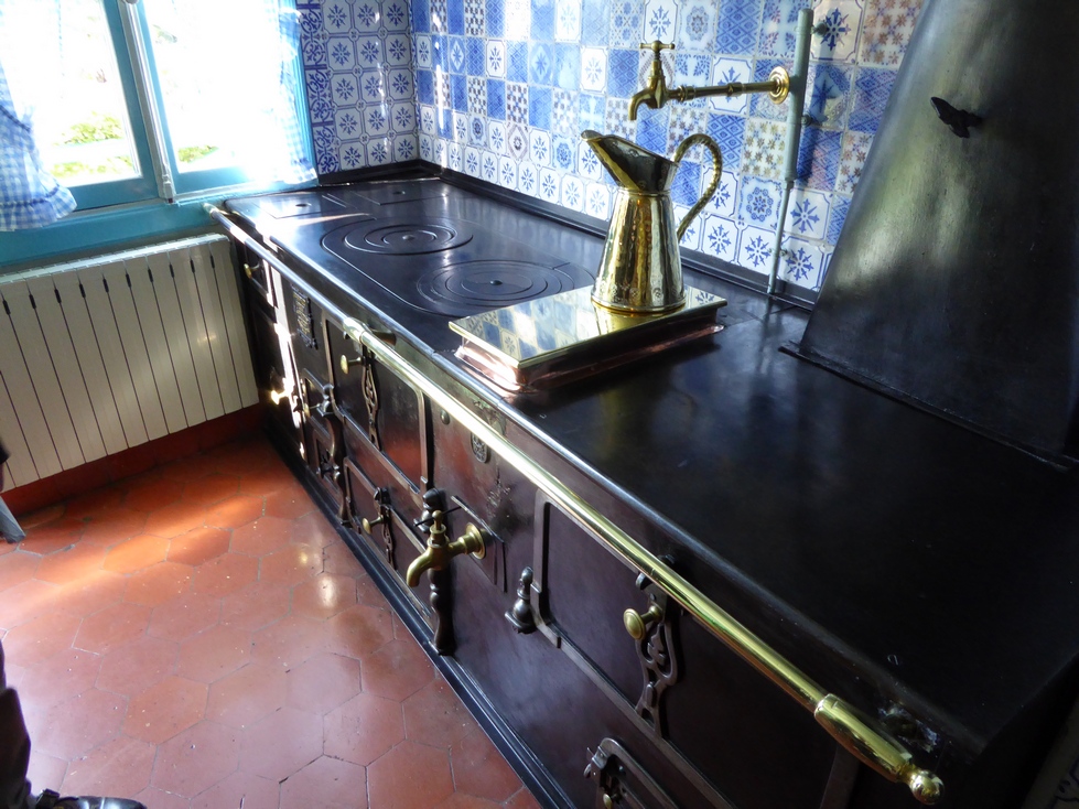 The Money kitchen lined with the polished copper pans. I was intrigued with the stove. Even that was a work of art.