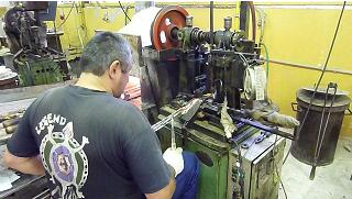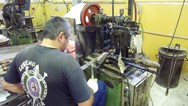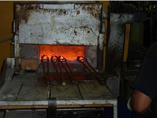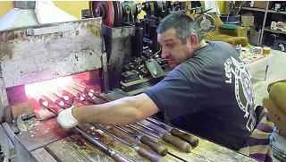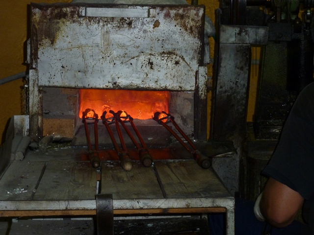 The second process we saw involved more "hands on" intervention. Here the worker takes a "rod" of molten glass and feeds it through a stamping machine. Once again the size and shape of the bead can be changed by changing the die of the stamper. Click on the left picture below and you will see a YouTube movie of the process.