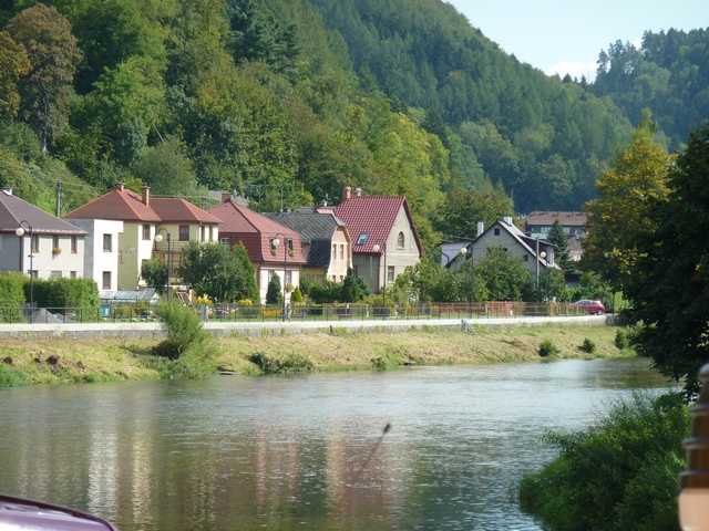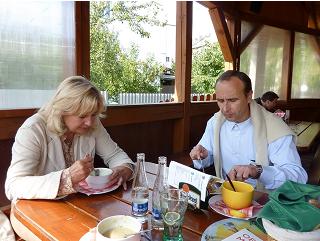 When we finished at the lampwork bead shop, it was time for lunch. We found a little cafe off the main street where we could have a typical Czech lunch while enjoying the bucolic setting. On the left is a picture from the lunch terrace and on the right is a picture of our guide Hana and our driver enjoying their bowls of soup.