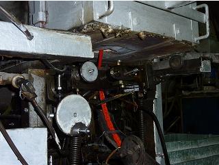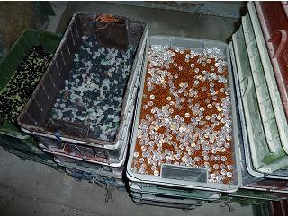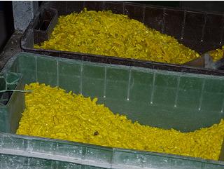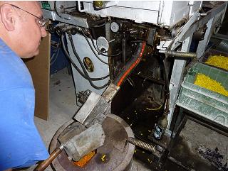The first machine we saw appeared to operate with only minor intervention. The raw glass pieces were stored in bins along side the machine. The glass was fed into a chamber where it is heated so it will flow out the bottom through an opening that forms it into a hot continuous , molten glass rod. This viscous rod gets stamped and shaped into a ribbon of beads. I think the shape and size of the bead can be changed by changing the die in the stamping unit and the aperture of the hole through which the moten glass flows.