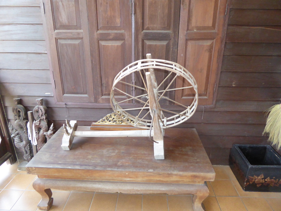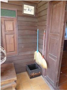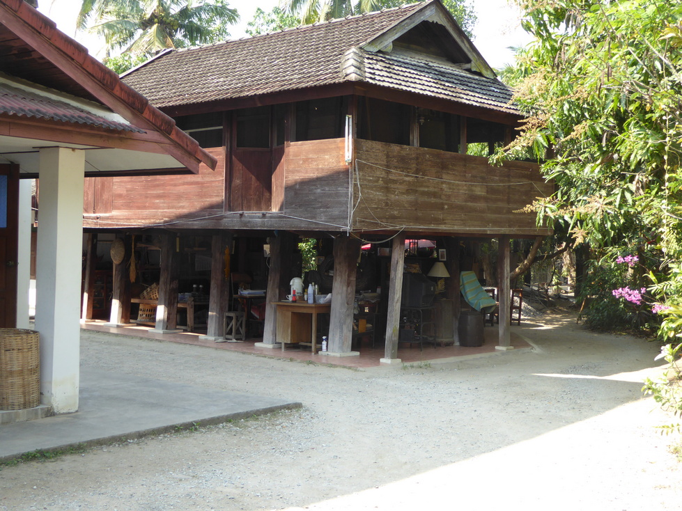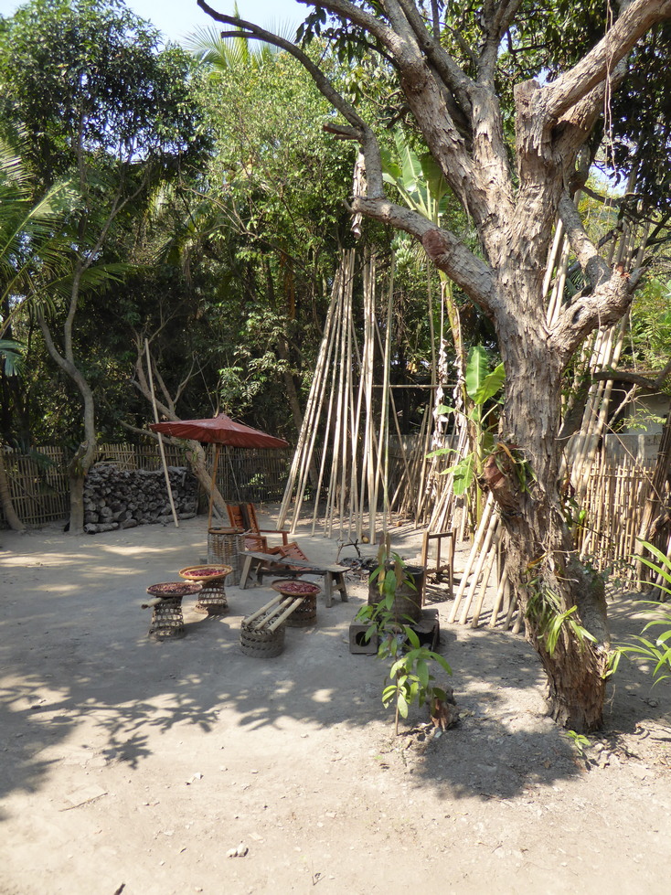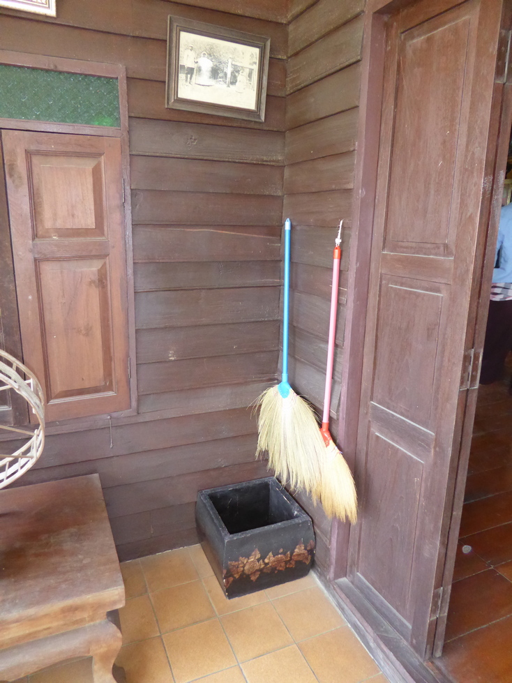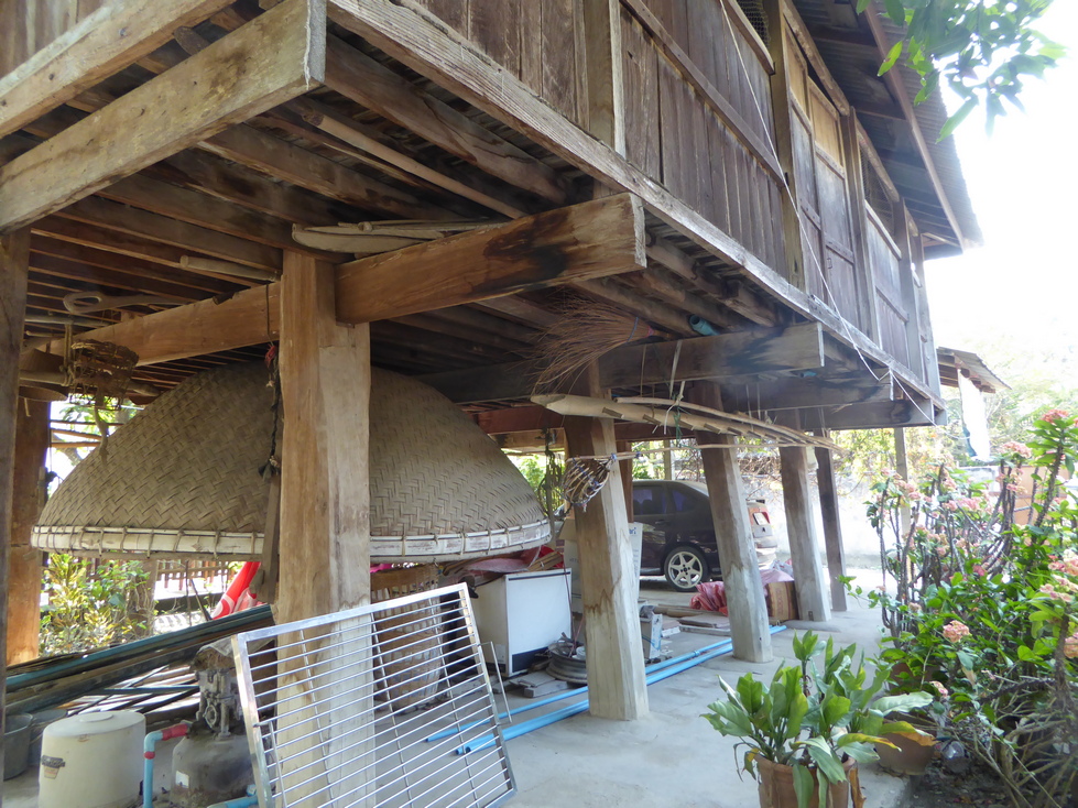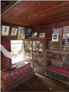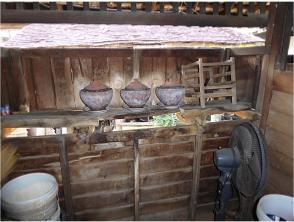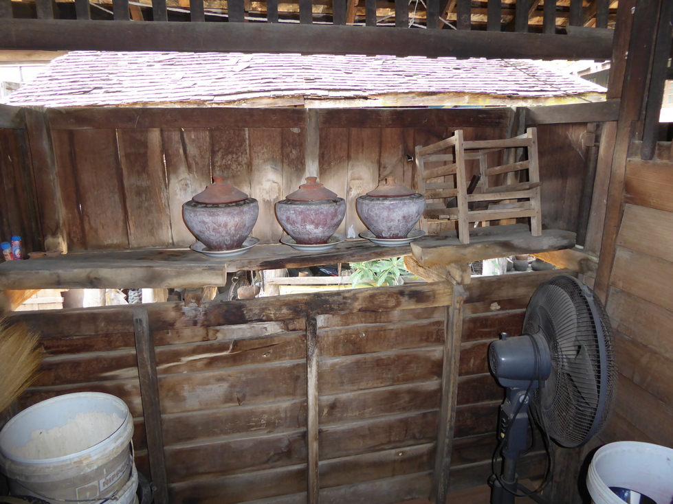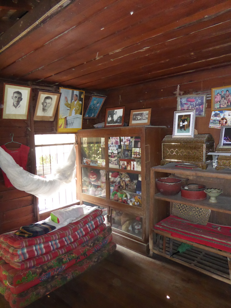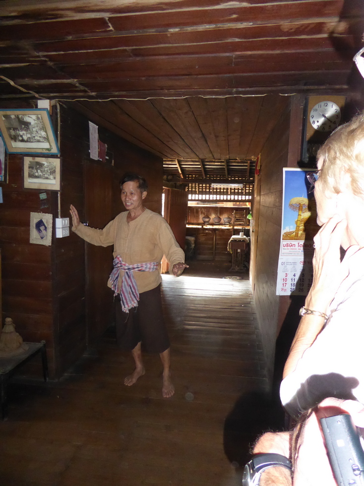 Our host greets us and starts the tour of his home. The buildings are on stilts with the living areas upstairs and storage below. The living areas are quite simple with very little furniture. The walls are filled with pictures and there are cabinets and shelves of various objects.