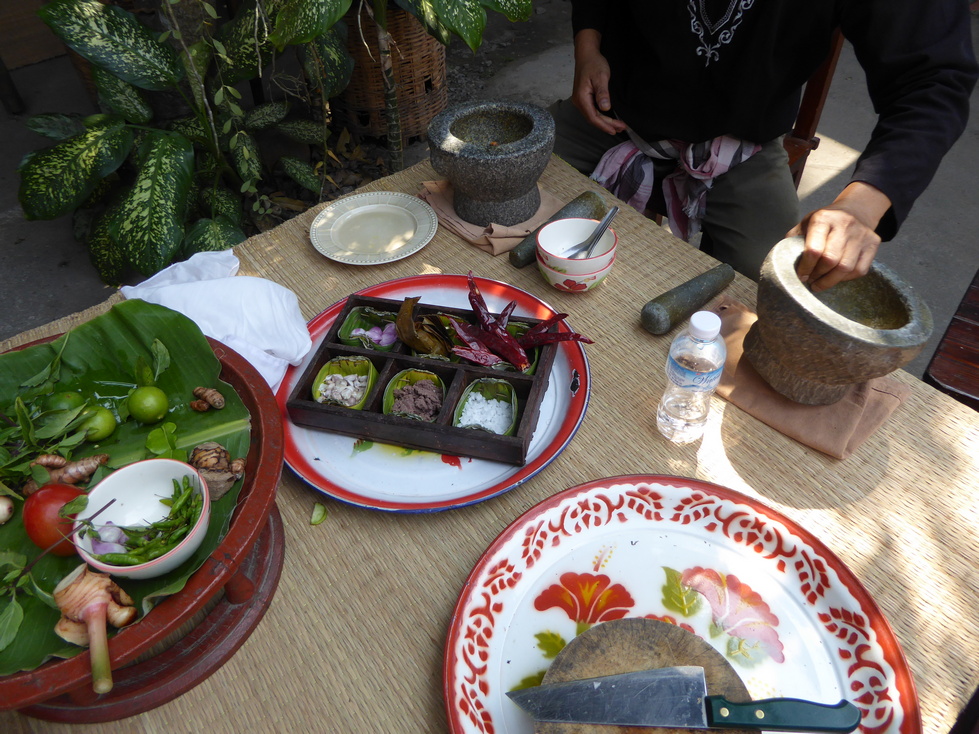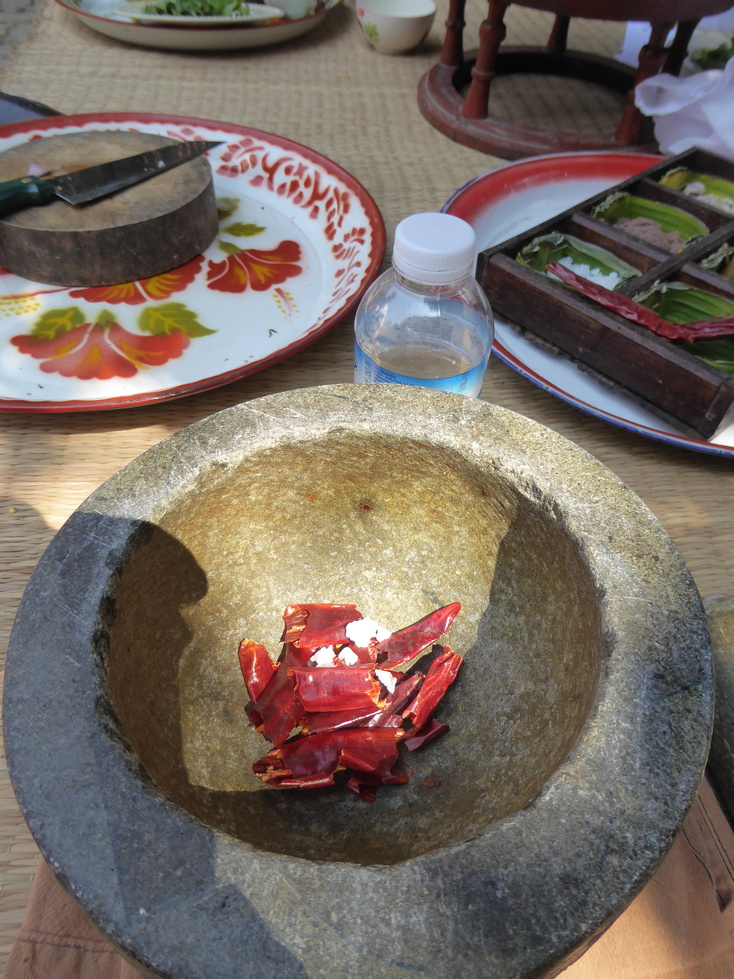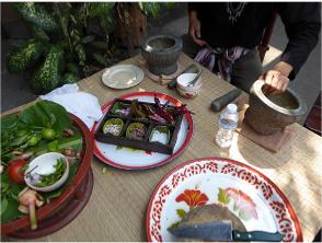 On the left is our instructor and a tray of some of our fresh veggies. On the right are some of the peppers ready to be ground. That was one of my jobs.