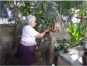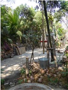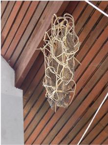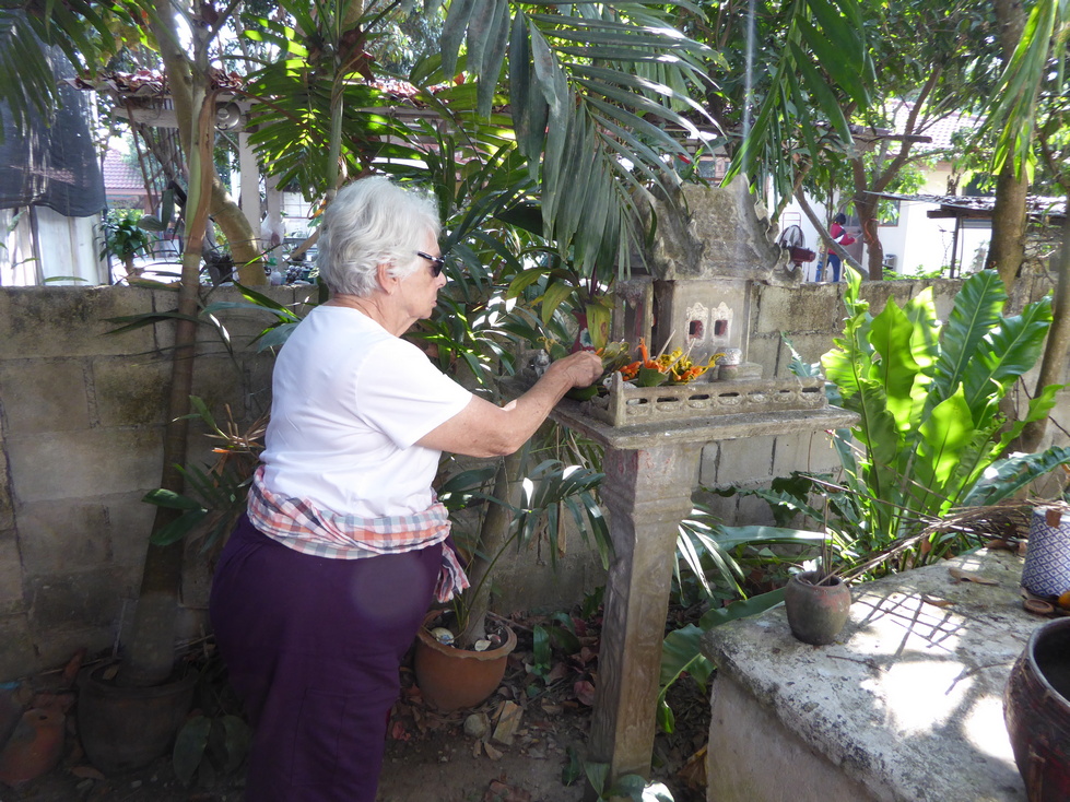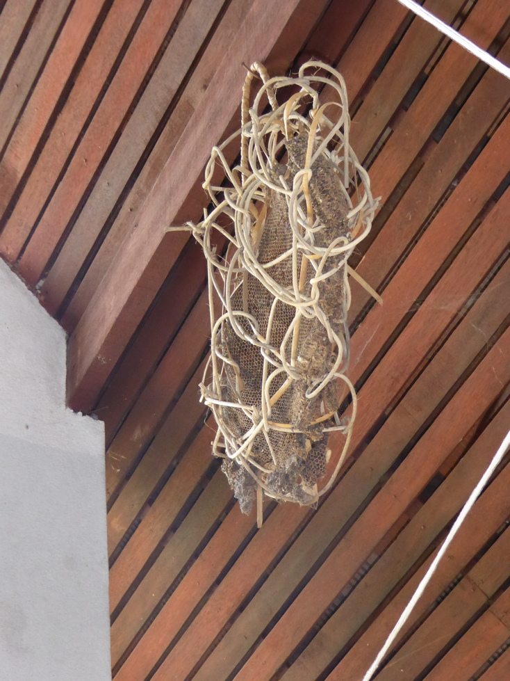 Outside, everybody was given a small flower bundle to place on the "spirit house". I also noticed the unusual container for the bee hive.