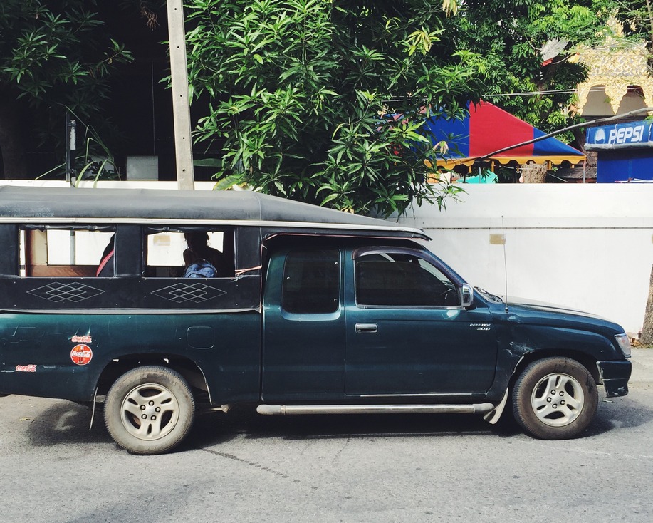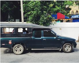 We transferred to a "songthaew". This is a pickup truck that has been converted into one of the most uncomfortable modes of transportation. The back of the truck has been fitted with two HARD benches that run front to back and have NO cushions. Below is a picture of a songthaew which is FAR better than the one in which we rode.