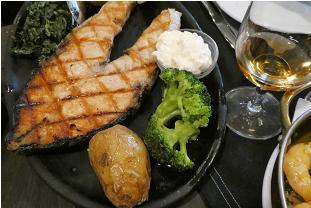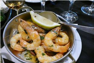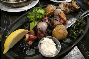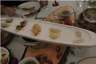 The four dishes, starting lower left and working clockwise are salmon, prawns, octopus and a meat dish.