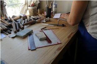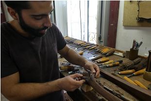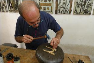 Below we have a craftsman doing some fine metalwork. Also embossing some leather. We made a short video of some of the craftsmen at work. Click HERE to view the video.